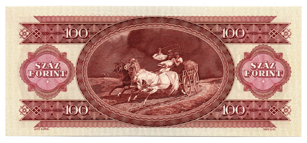 Hátlap: lovaskocsi, részlet Lotz Károly Menekülés a közlegő vihar elől című képéből.