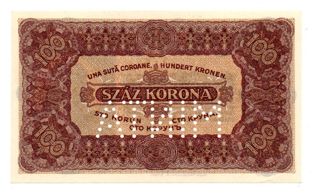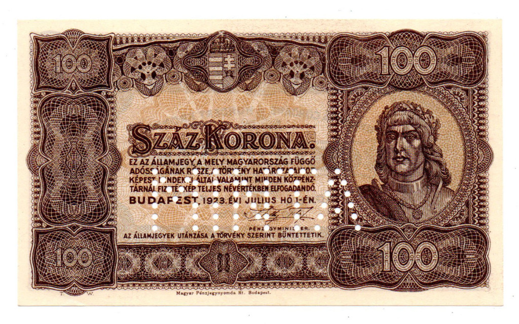 100 Korona Államjegy 1923 Magyar Pénzjegynyomda aUNC-UNC MINTA perforáció