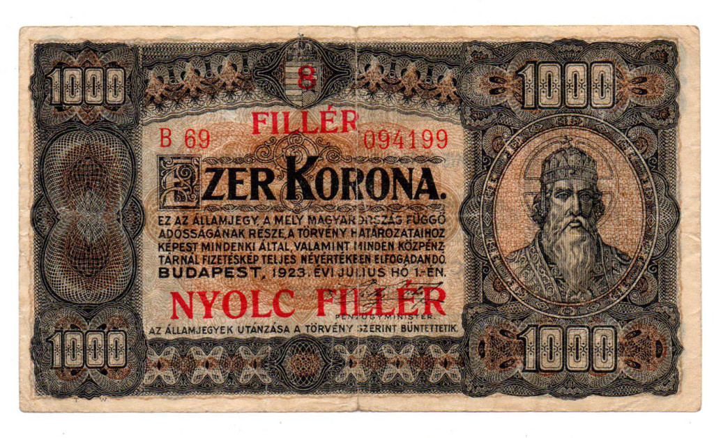 1000 Korona Államjegy 1923 8 FILLÉR felülbélyegzéssel F
