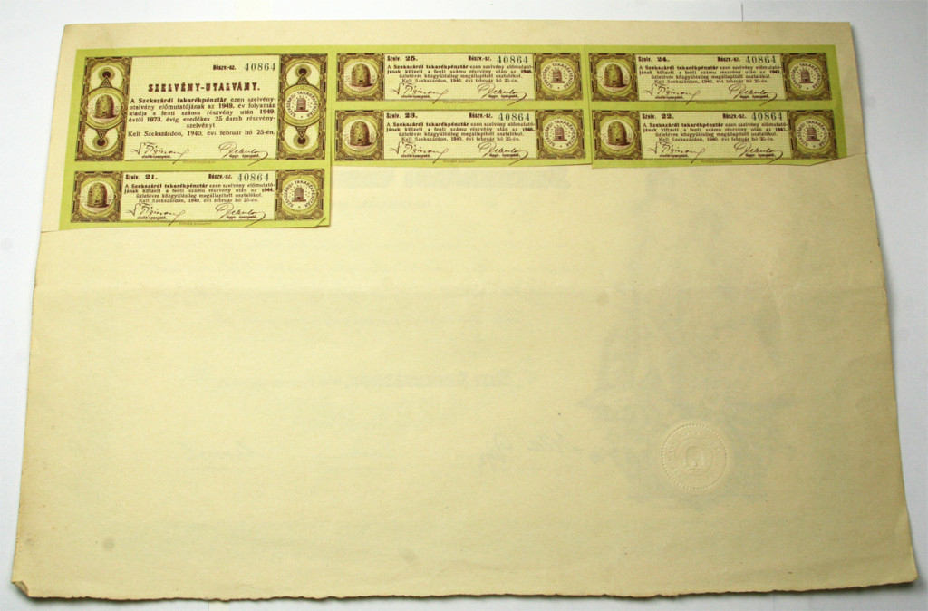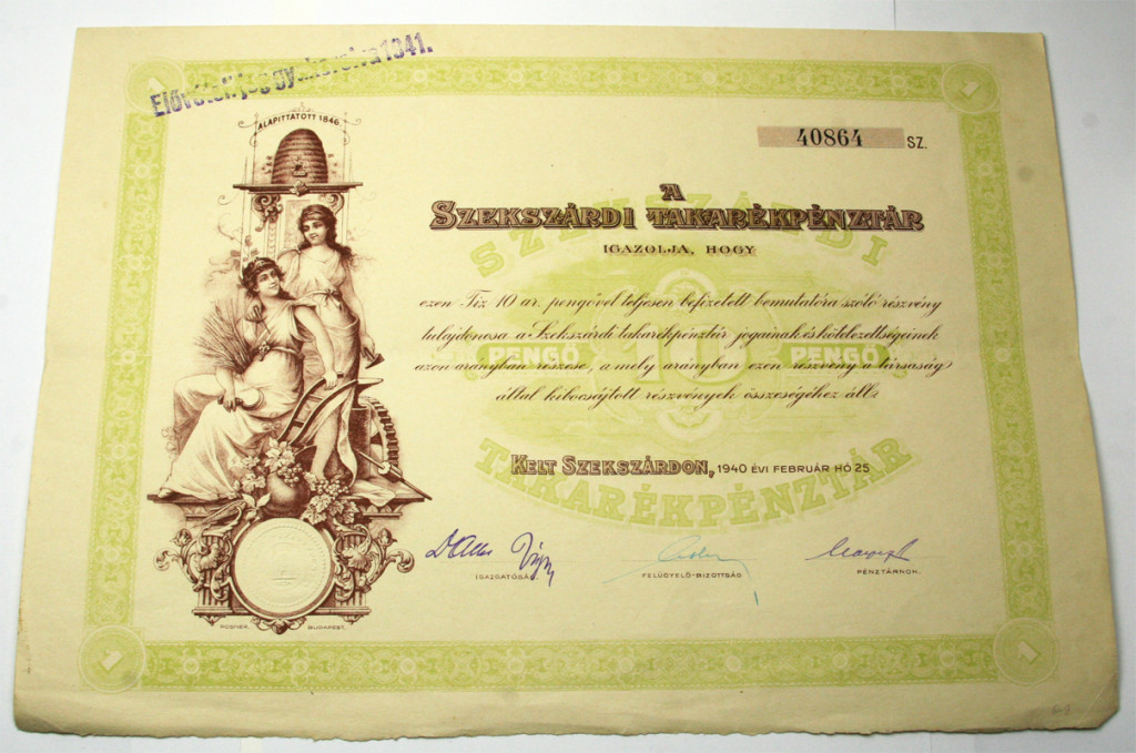 1940 Szekszárdi Takarékpénztár 10 Pengő Részvény