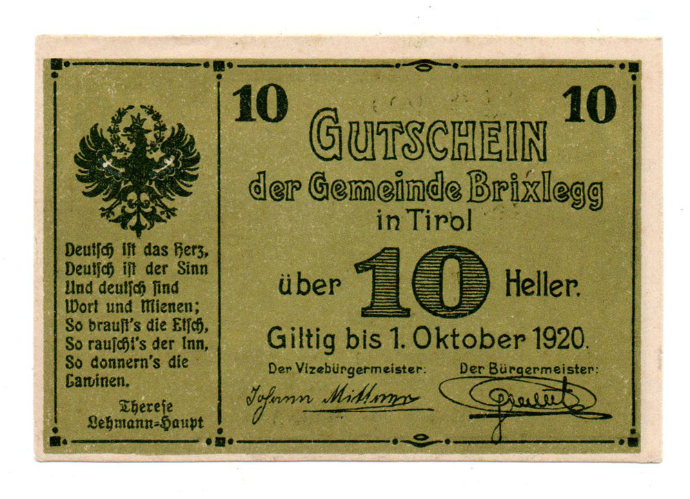 Ausztria Notgeld Brixlegg 10 Heller 1920