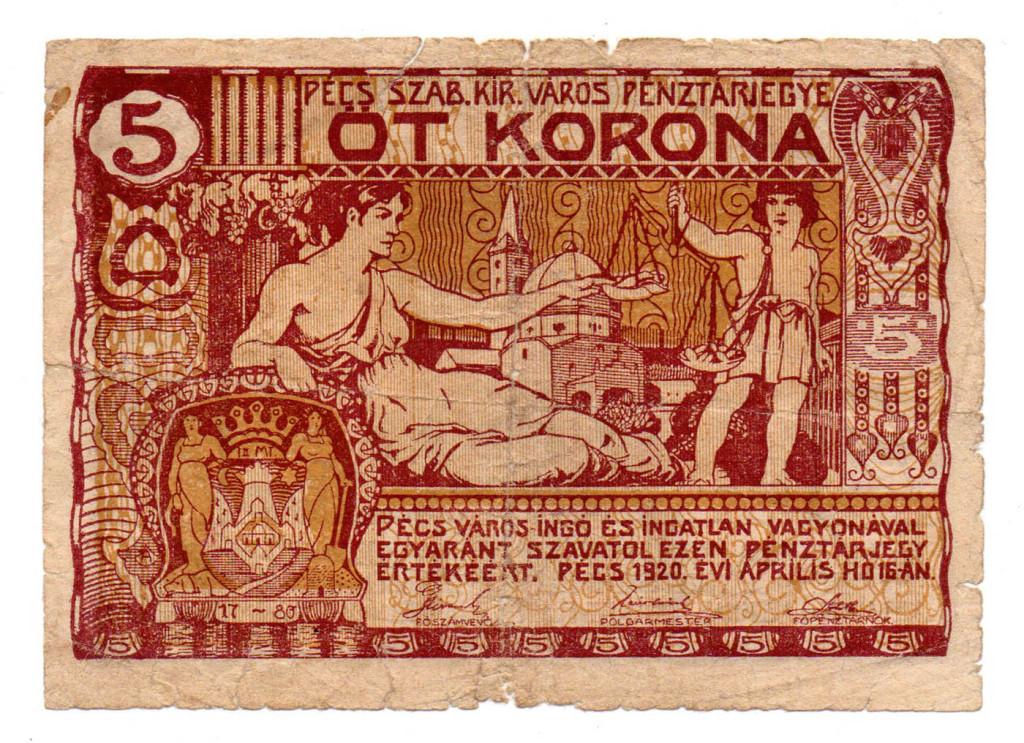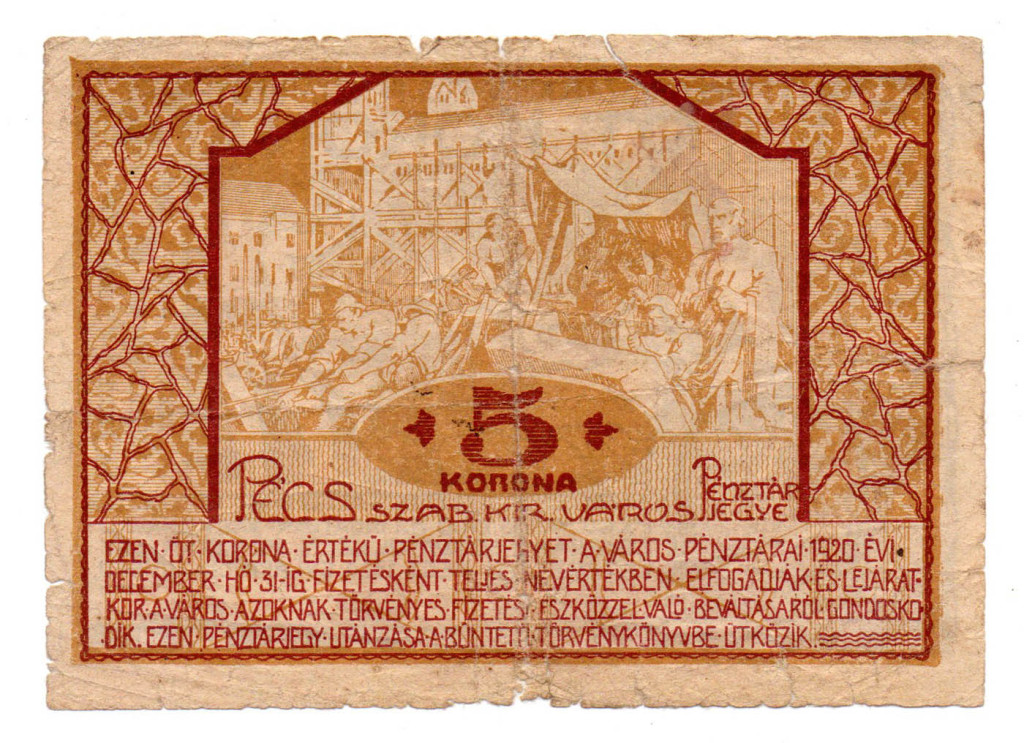 Pécs város Házipénztár 5 Korona pénztárjegy 1920 VG szükségpénz