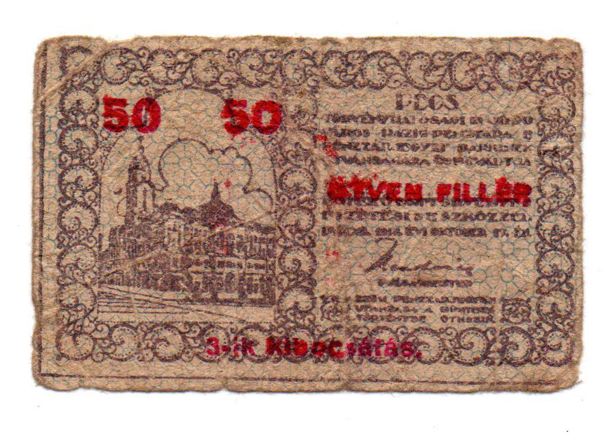 Pécs város Házipénztár 50 Fillér pénztárjegy 1919 3. kiadás G-VG