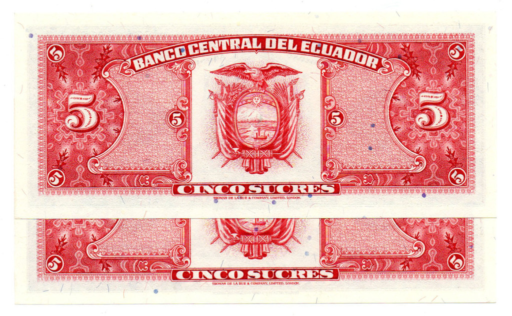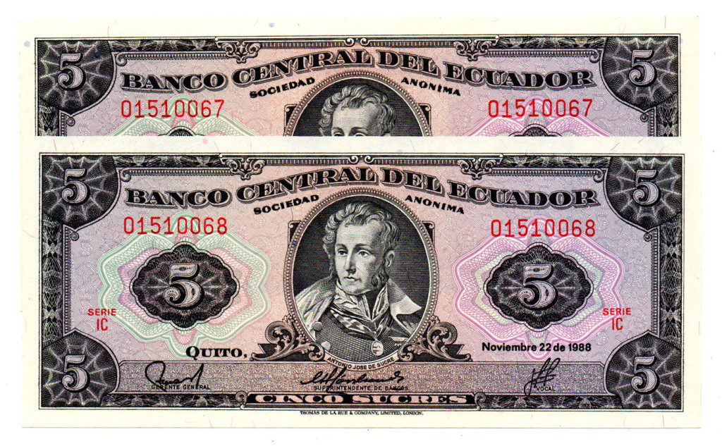 Ecuador 5 Sucres Bankjegy 1988 P113d3 sorszámkövető pár