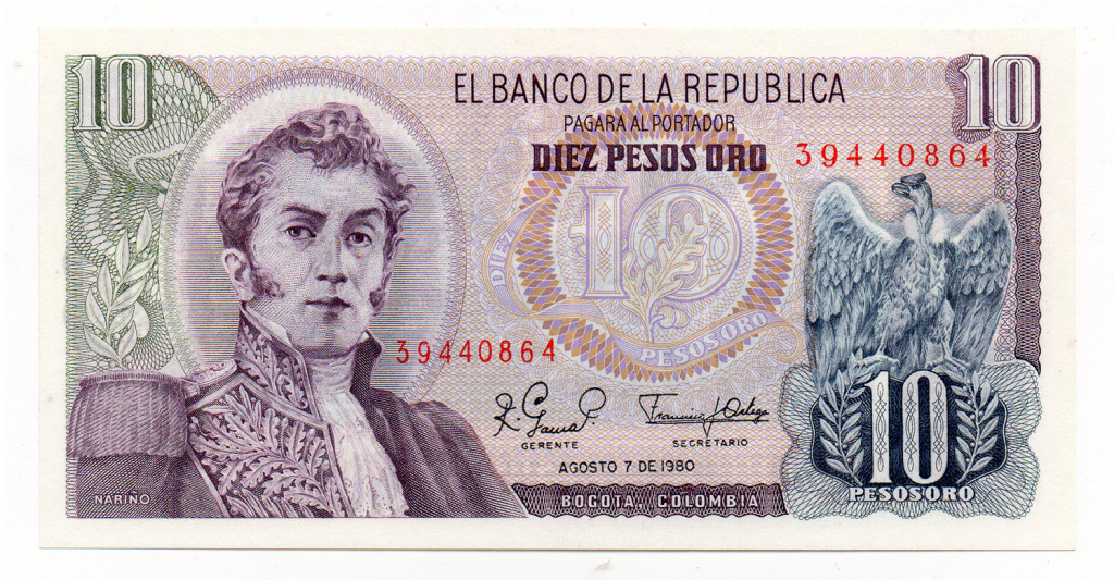 Kolumbia 10 Peso Oro Bankjegy 1980 P407g UNC