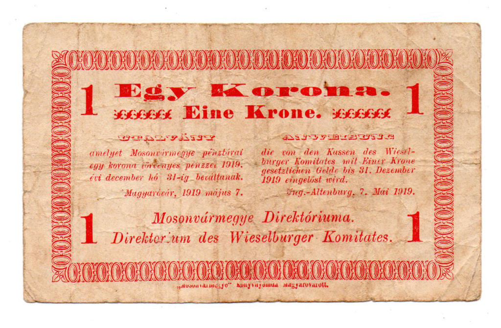 Mosonvármegye Direktóriuma 1 Korona utalvány 1919