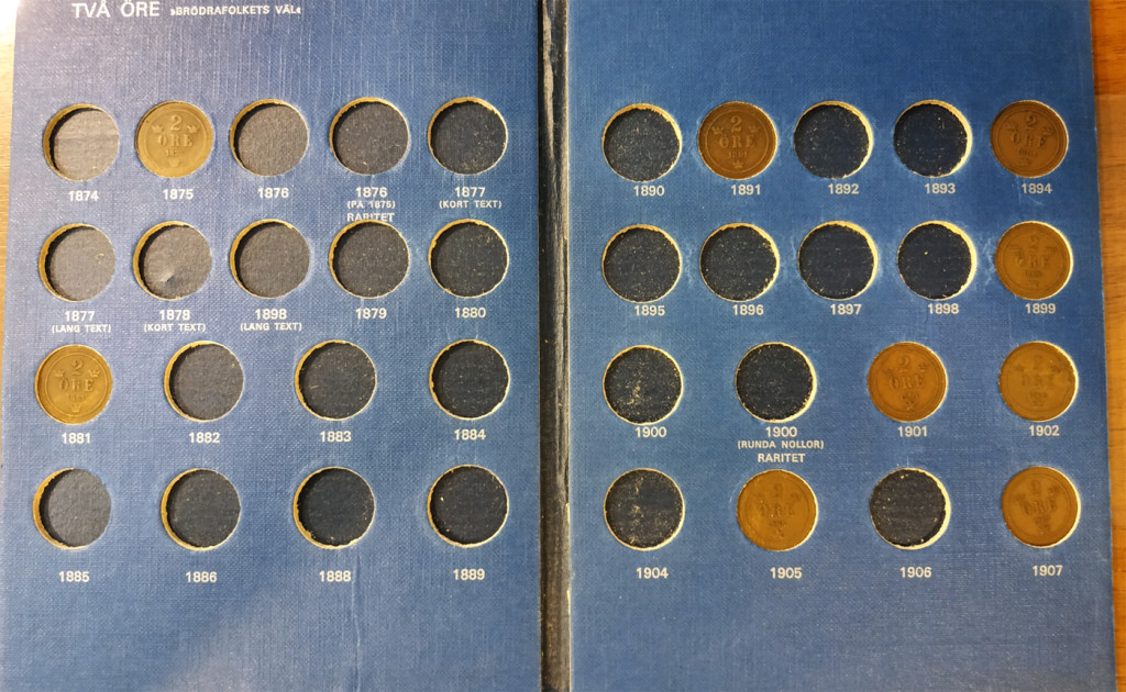 Svéd érme gyűjtői album 2 Öre 1874-1907 benne 9db érme
