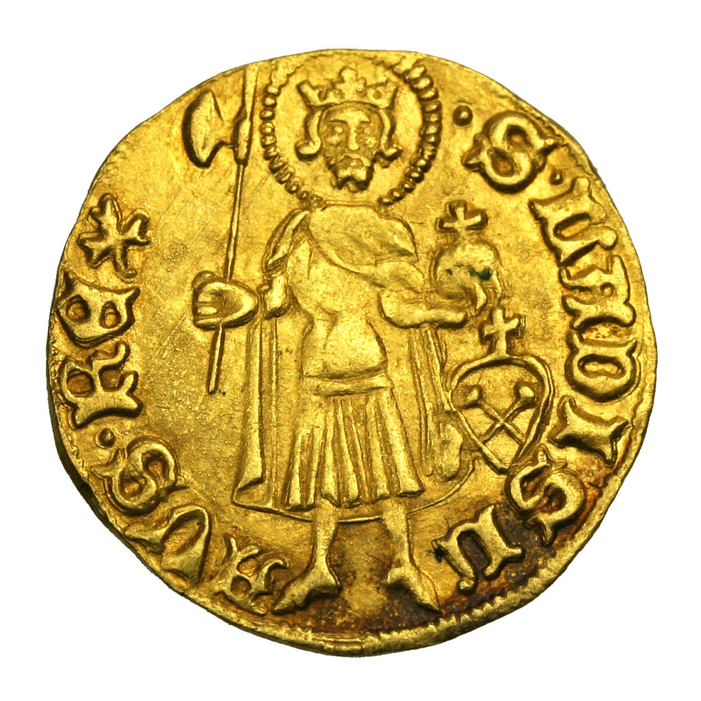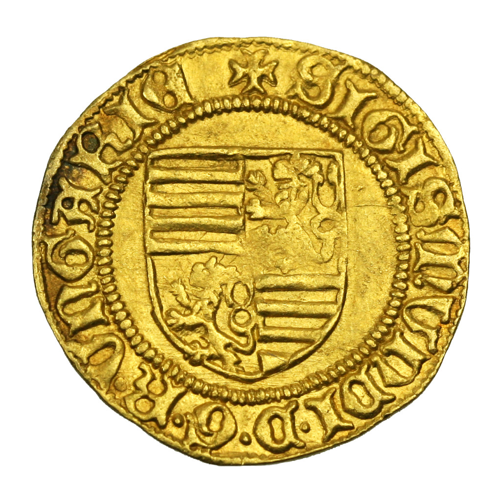 +SIGISMVNDI•D•G•R•VnGARIE négyrészt osztott címerpajzs Árpád-sávokkal és  cseh oroszlánnal